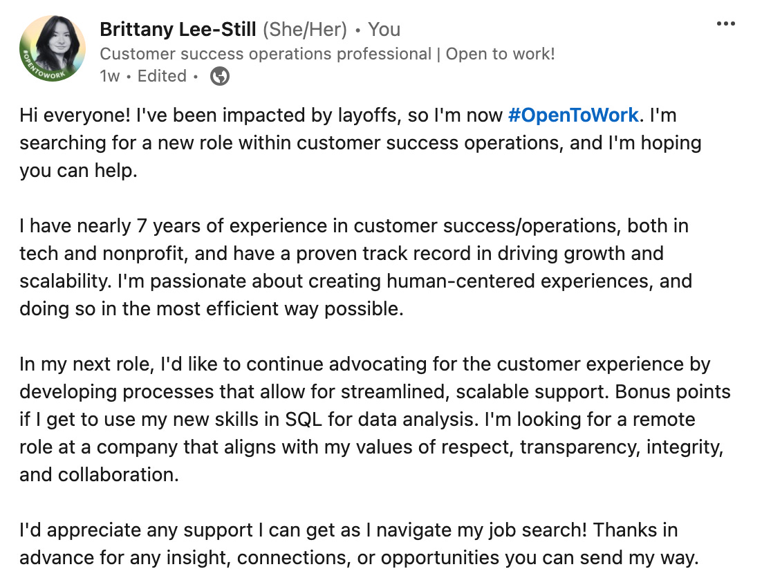I’ve never been a big LinkedIn user, so I didn’t know what to expect when I published my #OpenToWork post. I was blown away not only by the engagement, but by the kindness I received. Reading thoughtful comments from people who worked with me, either as coworkers or as students, was exactly the mood booster that I needed after being laid off. It also inspired me to do the same. Despite my dislike of LinkedIn, I’ve decided to become more active so I can help celebrate people, boost their posts, and support job seekers in the way those people did for me.